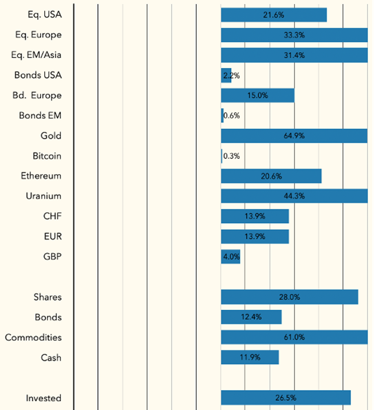 For 2026, we maintain a broadly similar positioning, with an approximately equal allocation between equities and bonds. Roughly half of the strategy portfolio remains invested in gold and Swiss-franc-denominated assets, including short-duration corporate bonds and defensive equities. This results in a materially more conservative profile than that of a typical multi-asset portfolio.