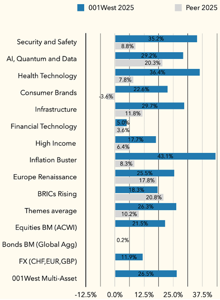 In 2025, our multi-asset “Inflation Buster” theme delivered a +43.1% absolute return in USD and was the best-performing portfolio. We believe this theme may again generate outsized returns in 2026.