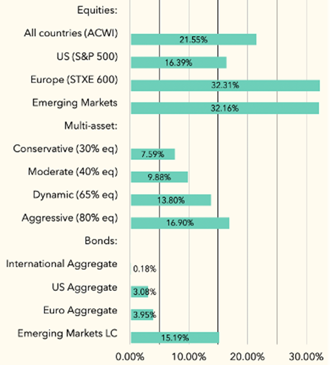 Unusually, all our investment classes are in positive territory. Overall, our multi-asset strategy portfolio has returned 26.5%. This is roughly twice the return of a typical multi-asset portfolio with equal equity/bond allocation, i.e. like ours.