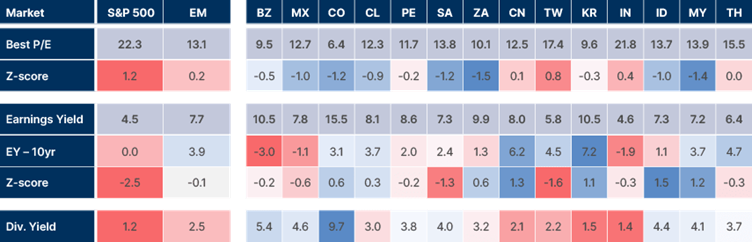 Figure: P/E; earnings yield (EY) and EY – 10yr govt: S&P; DM ex-US; MSCI EM; and largest MSCI EM countries